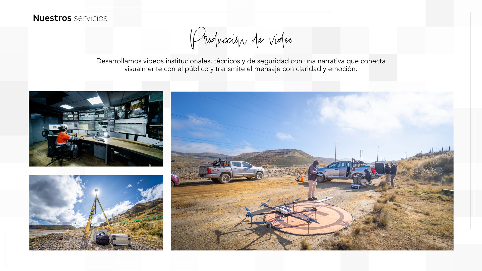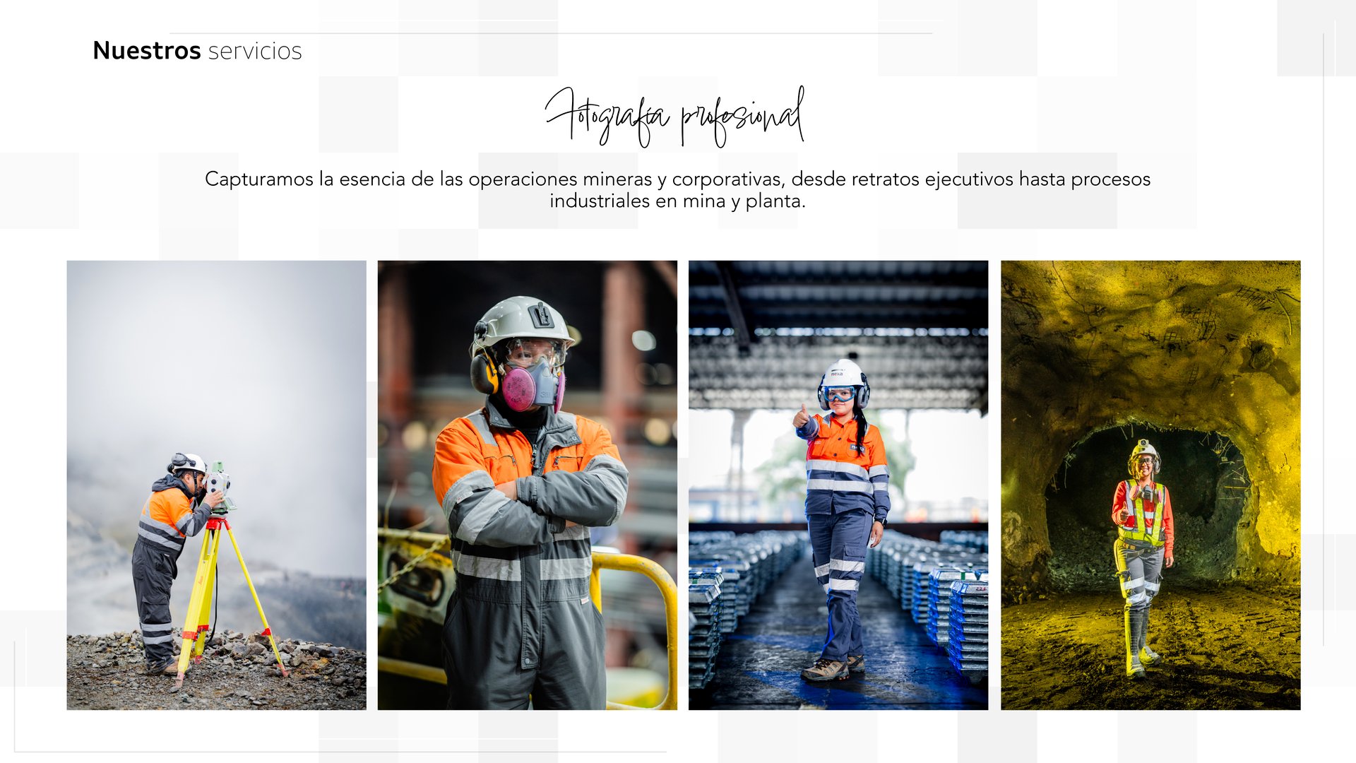 Hemos trabajado de cerca con empresas del sector minero, documentando sus operaciones, proyectos y valores a través de imágenes y narrativas que comunican con precisión, estética y propósito.